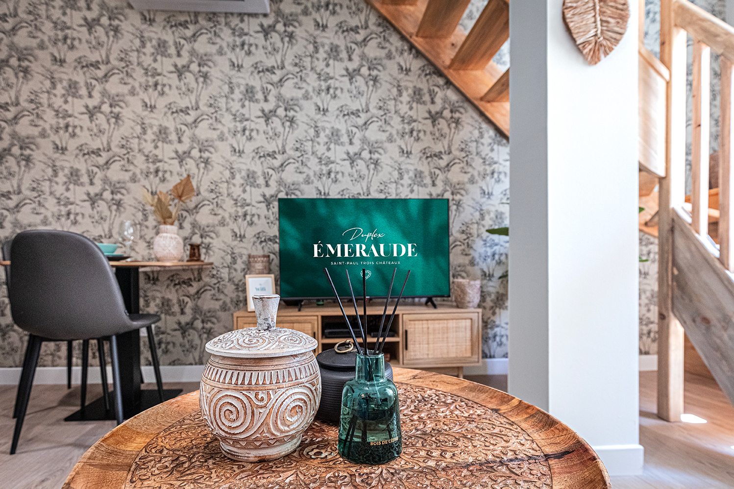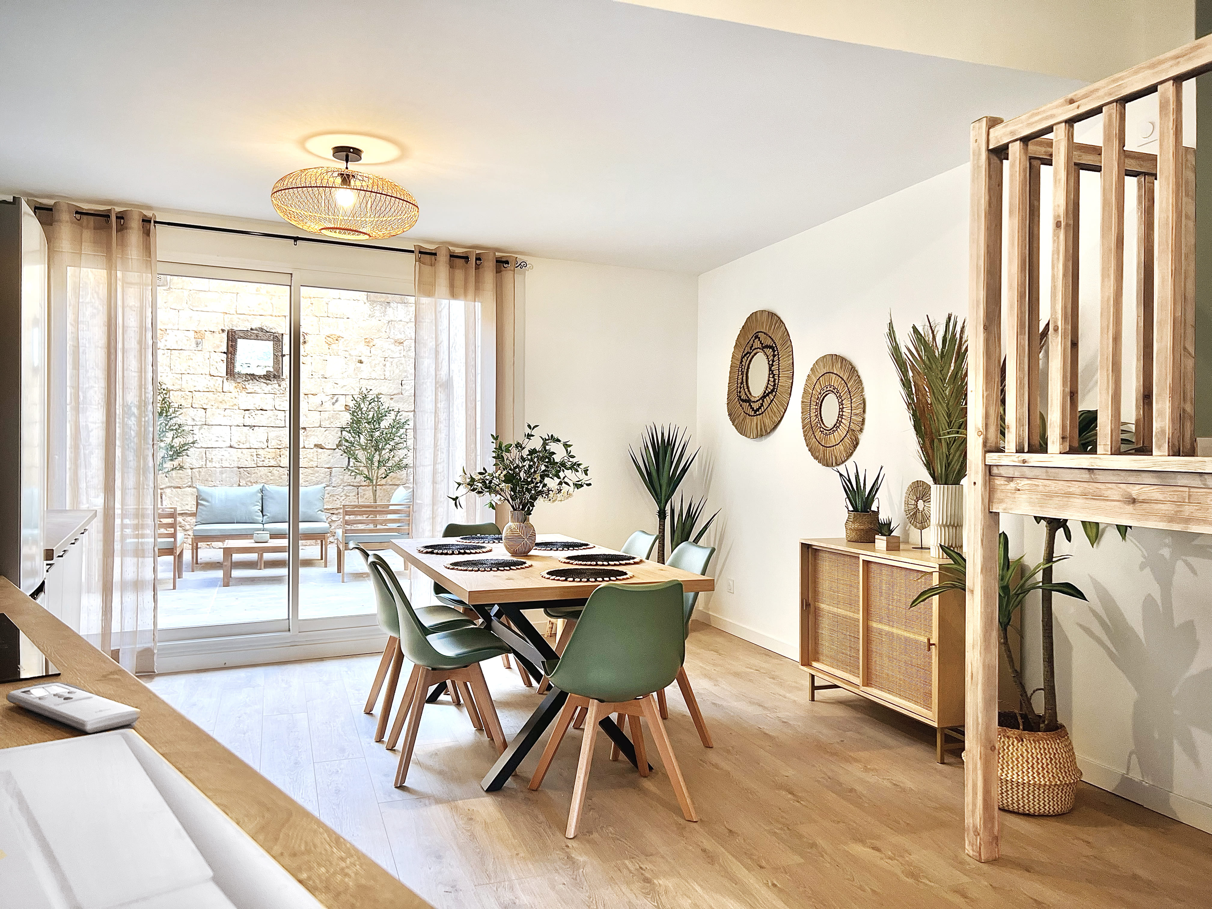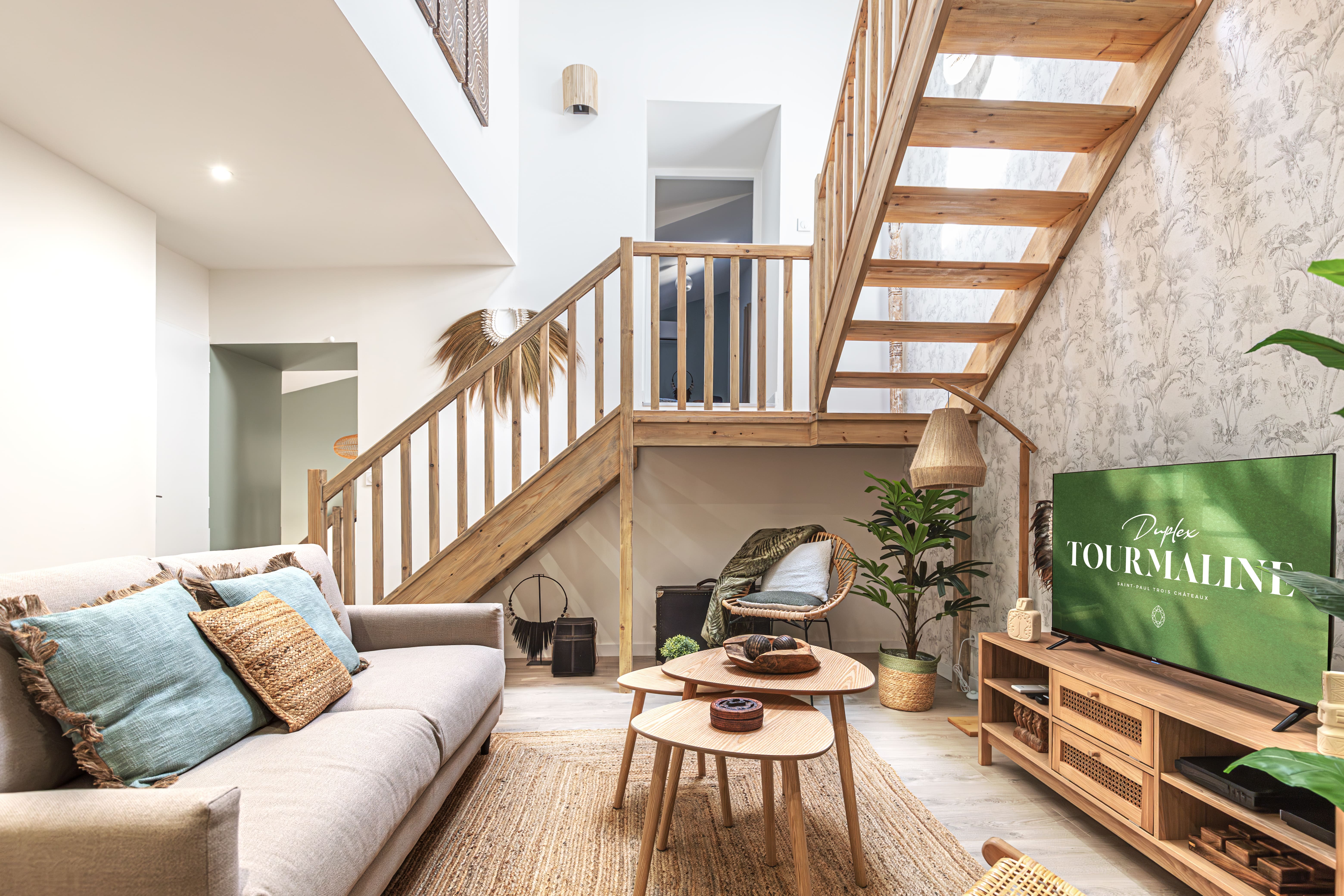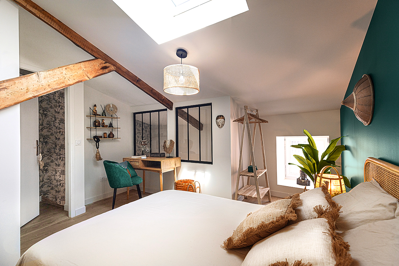 Travailleurs en déplacements professionnels ou voyageurs pour un séjour en Drôme Provençale, bienvenue en terre d’évasion. Ce lumineux T2 duplex saura vous accueillir avec sa cuisine ouverte équipée et son séjour aux touches végétales et aux matières naturelles exotiques. À l’étage, destination repos et relaxation avec une salle de bain aux allures de spa privé ainsi qu’une grande chambre meublée au charme paisible et naturel Balinais et son espace de travail. La climatisation est réversible dans tout l’appartement.