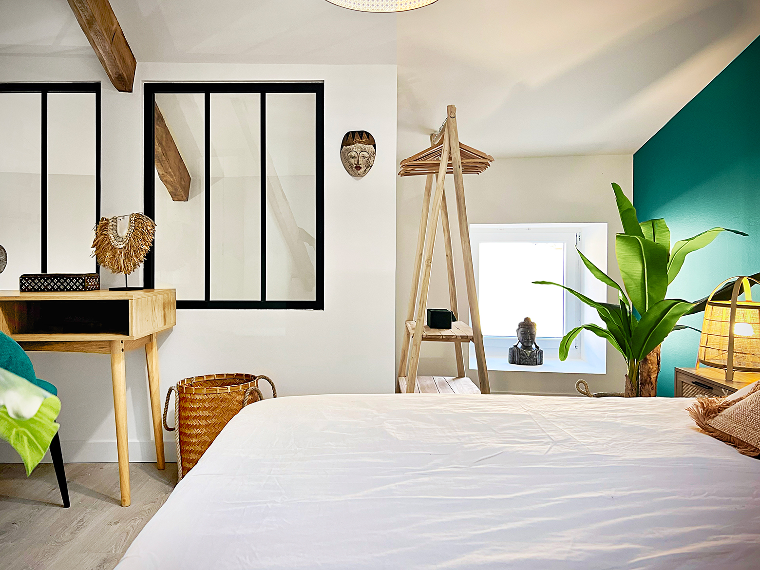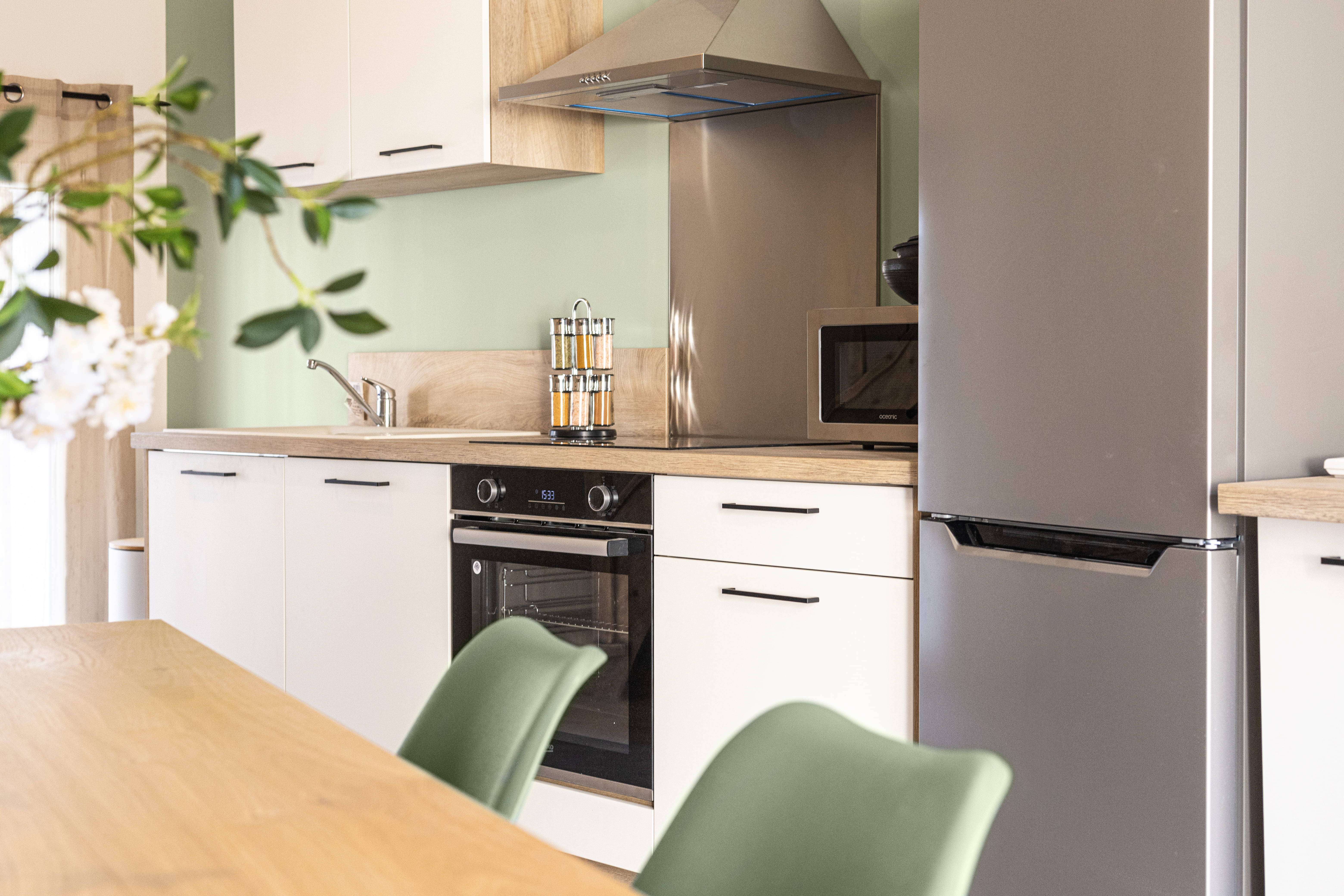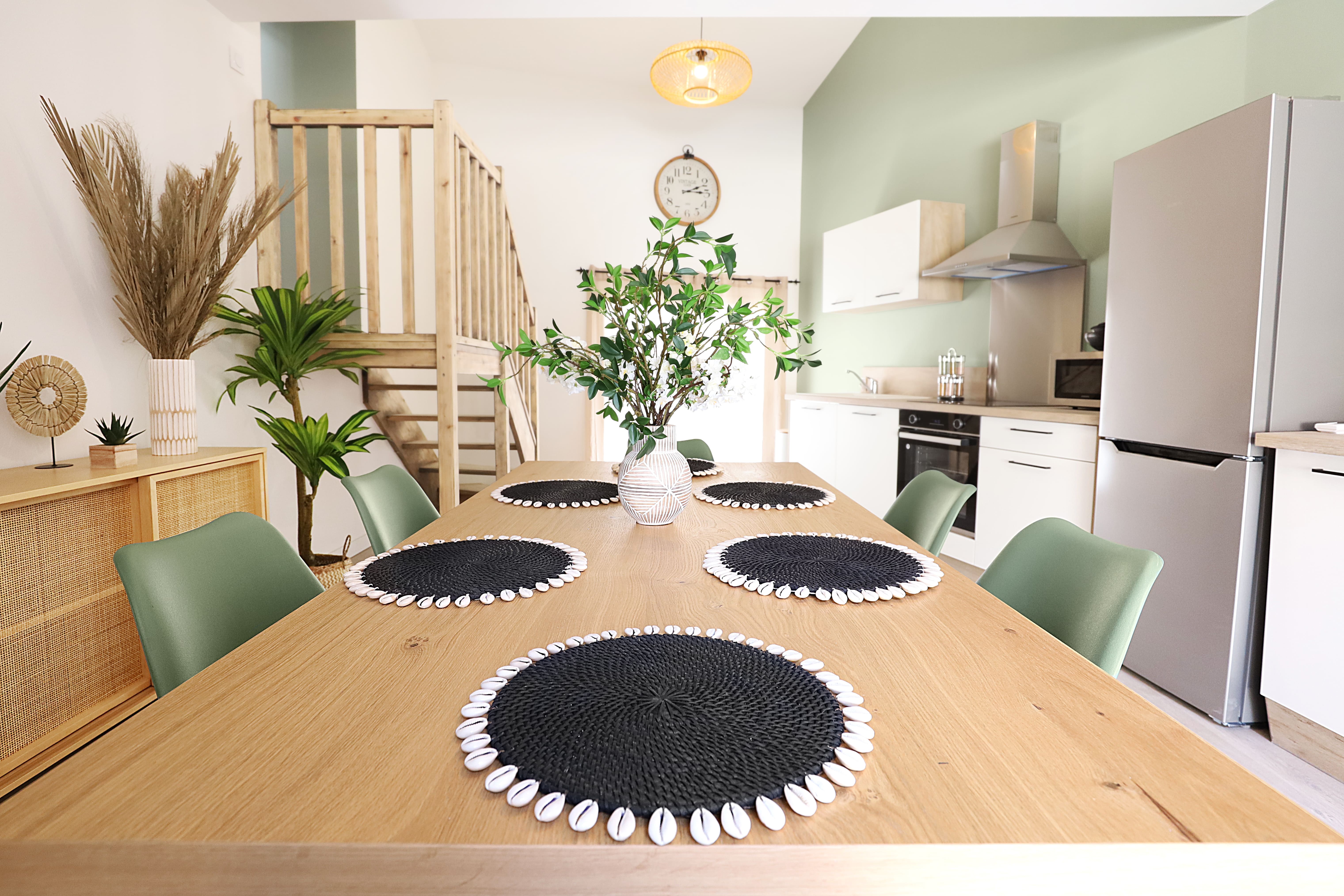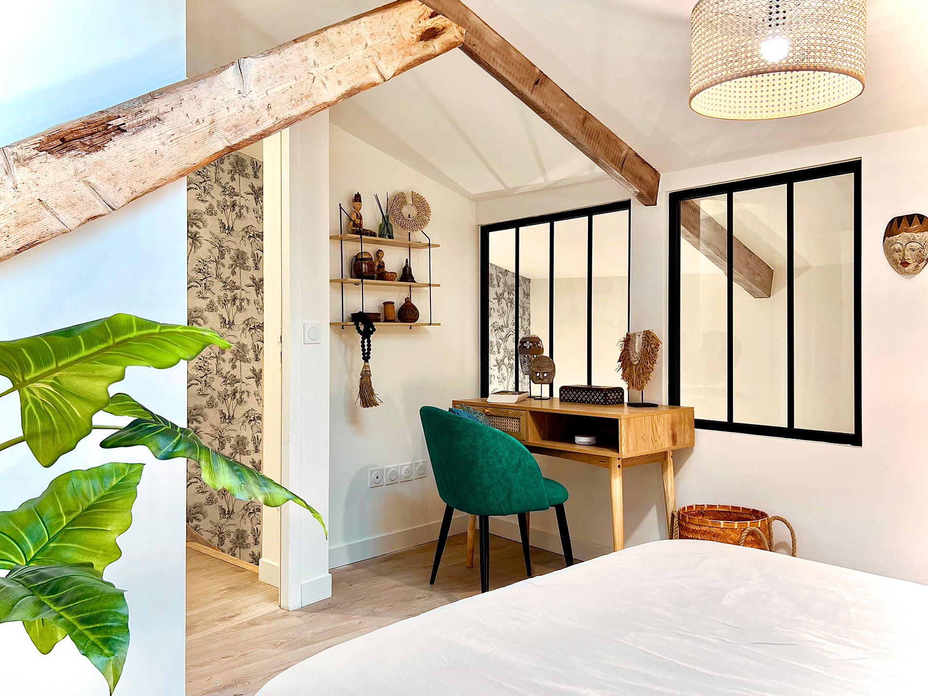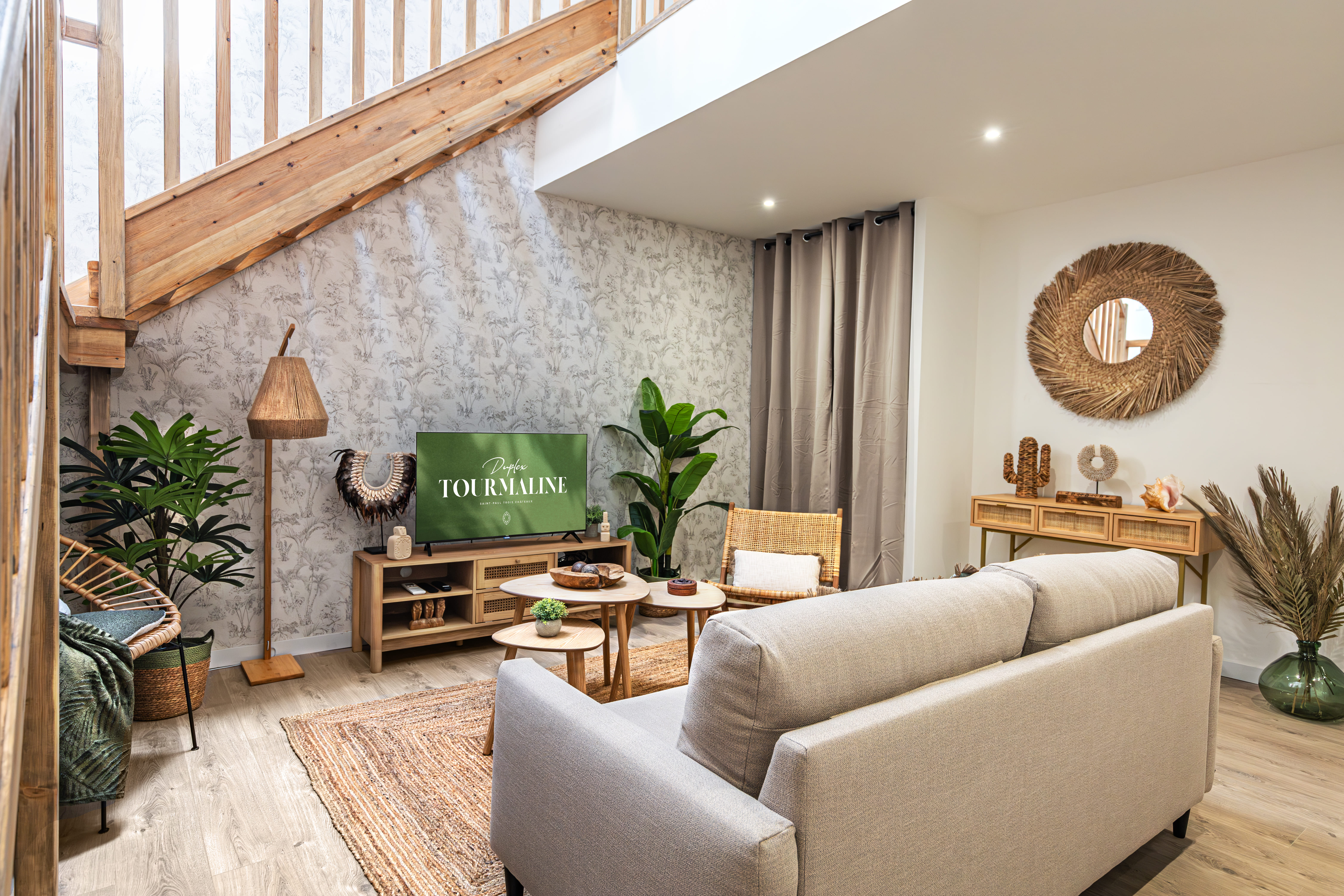 Travailleurs en déplacements professionnels ou voyageurs pour un séjour en Drôme Provençale, bienvenue en terre d’évasion. Ce lumineux T2 duplex saura vous accueillir avec sa cuisine ouverte équipée et son séjour aux touches végétales et aux matières naturelles exotiques. À l’étage, destination repos et relaxation avec une salle de bain aux allures de spa privé ainsi qu’une grande chambre meublée au charme paisible et naturel Balinais et son espace de travail. La climatisation est réversible dans tout l’appartement.