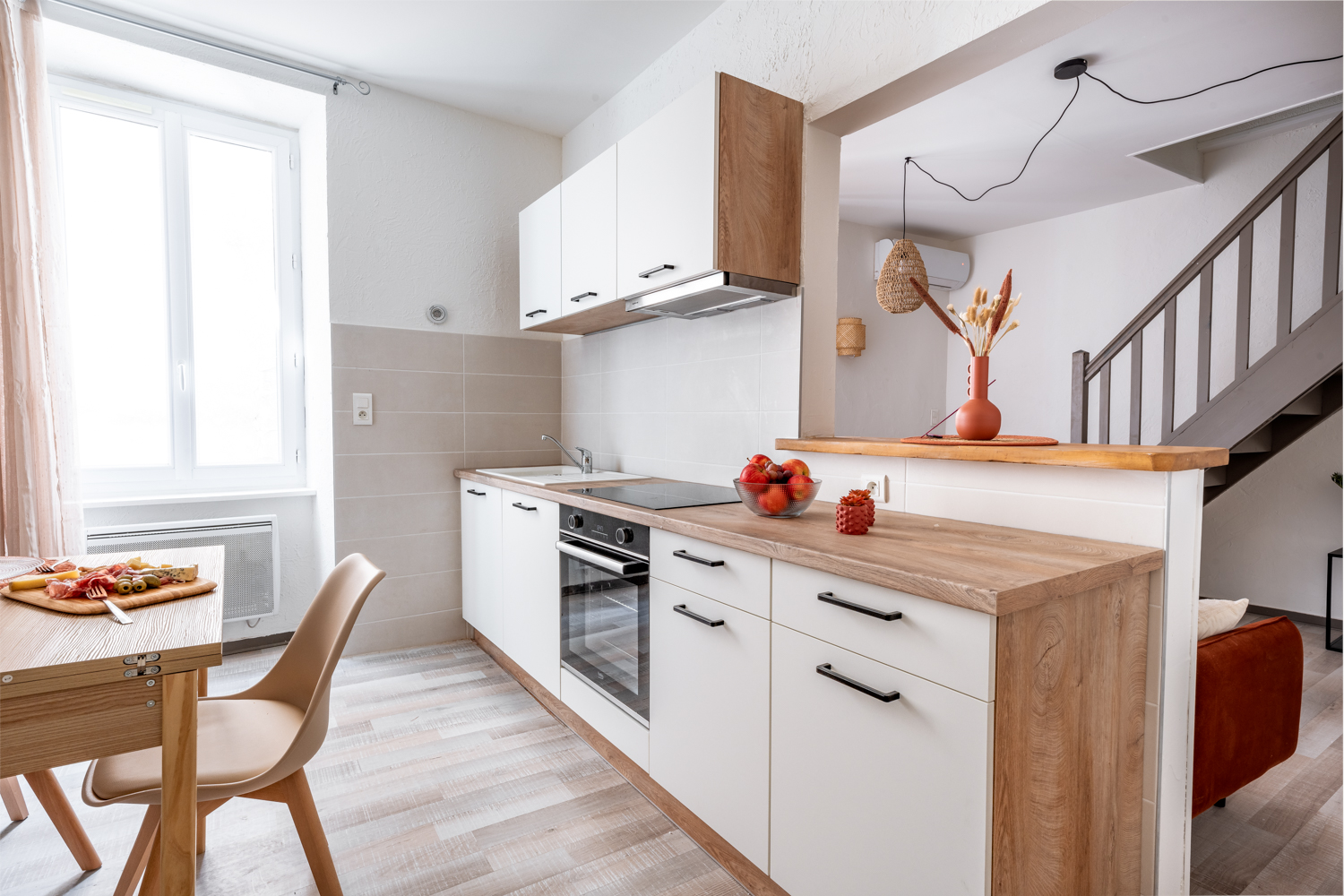 Il est un endroit aux accents terracotta où l’on se sent intimement chez soi. Ce charmant T3 très lumineux à l’atmosphère naturellement chaleureuse propose une cuisine ouverte entièrement équipée où déjeuner, un séjour convivial, une large salle de bain avec wc et deux chambres aux tons chauds et poutres apparentes à l’étage. La climatisation est réversible dans tout l’appartement.